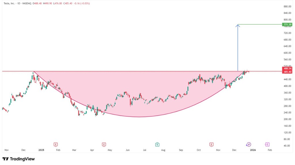 The chart shows a clear cup formation. As long as price remains above 485, the 771 level stays technically valid as a long-term target.